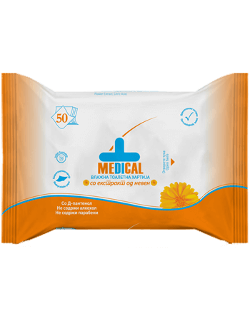Влажната тоалетна хартија Medical ефикасно ги отстранува нечистотиите од интимните делови на телото. Екстрактот од невен и Д-пантенол имаат смирувачко дејство, па производот се препорачува и за лична хигиена кај лица со чувствителна кожа. Ги одржува чувствителните делови од телото чисти и освежени. Пријатниот мирис го надополнува чувството на свежина. Влажната тоалетна хартија Medical е биоразградлива, растворлива во вода и не предизвикува запушување во WC школката, при што се распаѓа и уништува по природен пат. При една употреба може да се фрлат најмногу 3 парчиња влажна тоалетна хартија.